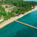 Plaža: v neposredni bližini, betonirana, deloma peščena s travnatimi površinami, obdana z naravno senco velikih borovcev. Ob plaži igrišča za odbojko, balinanje, namizni tenis, olimpijski in otroški zunanji bazen z morsko vodo, otroška igrala in peskovniki. Bar na plaži. Možnost najema senčnikov in ležalnikov (doplačilo).
